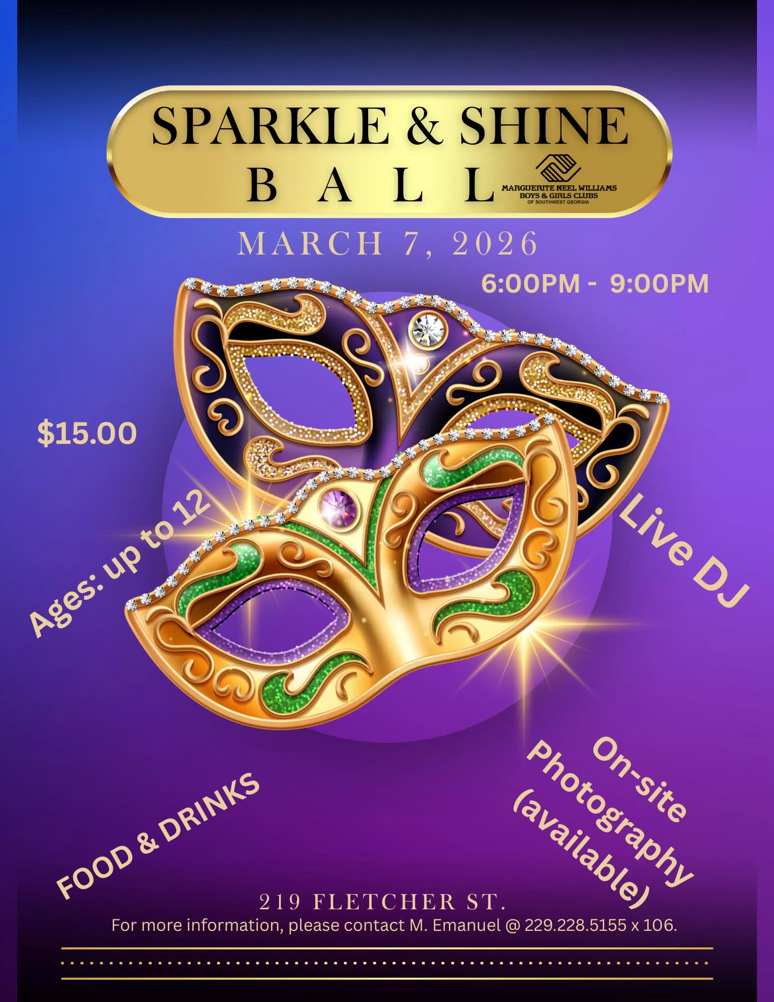 Guests ages 12 and up are invited to the Sparkle & Shine Ball. Enjoy a Mardi Gras theme, DJ, photos, food, refreshments, and more! Tickets are $15 and may be purchased online at the link below or by calling M. Emanuel at (229) 228-5155 x 106.